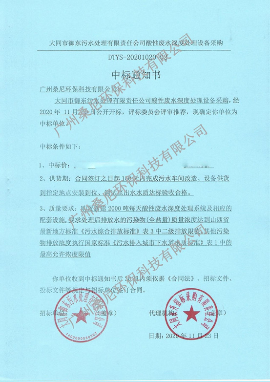 廣州桑尼環(huán)??萍加邢薰緟⑴c酸性廢水深度處理設(shè)備采購項目投標,以良好的信譽、豐富的經(jīng)驗、強大的技術(shù)實力以及專業(yè)的方案、合理的報價贏得了招標單位以及評標專家的肯定,成功中標。