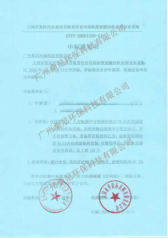 廣州桑尼環(huán)??萍加邢薰境晒χ袠烁邼舛葟U酸回收處理設(shè)備采購項目以良好的信譽、豐富的經(jīng)驗、強大的技術(shù)實力以及專業(yè)的方案、合理的報價贏得了招標單位以及評標專家的肯定,成功中標。